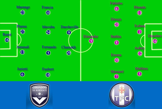 Un choix tactique habituel pour Ricardo avec un 4-4-2 classique et une défense qui commence à être de plus en plus alignée depuis la reprise. Ramé gardera la cage girondine, Marange à gauche, Jurietti à droite et une défense centrale nouvelle dans le championnat mais pas depuis le reprise : Jemmali et Planus. Au milieu de terrain deux récupérateurs avec Mavuba et Fernando, puis sur l?aile droite Faubert avec à l?opposée Francia. Deux attaquants avec Darcheville qui va tourner autour de Chamakh.